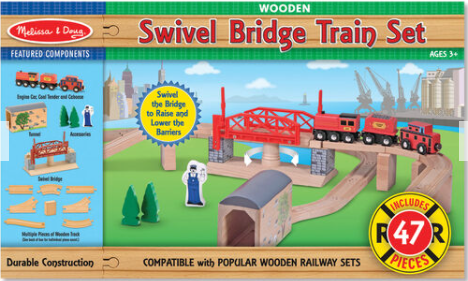 - 47-piece set includes swivel bridge, 3 train cars, tunnel, 34 track pieces and accessories.